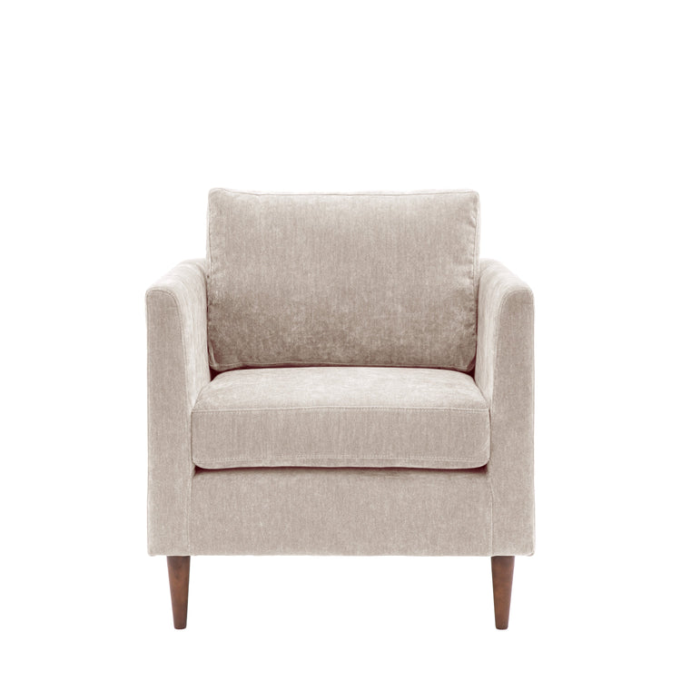 This modern armchair features a sleek and elegant design that complements various interior styles. It is upholstered in a luxurious soft natural fabric and includes plush deep seat and back cushions for ultimate comfort. The turned wooden legs beautifully mirror the gently tapered arms, adding a charming design element. Coordinating sofas are also available to create a cohesive aesthetic in your space.