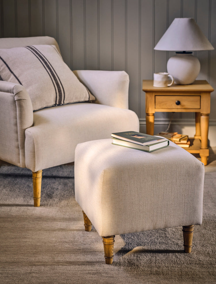Our versatile Aldwyn Ottoman brings style and practicality to any space. Suitable for use as a foot stool or as a side table, it has a simple design in a natural colour that will pair well with classic and contemporary interiors, and with any colour palette. It's made from sturdy ash wood and would be perfect paired with our Aldwyn Armchair. This is the smaller of two available sizes.