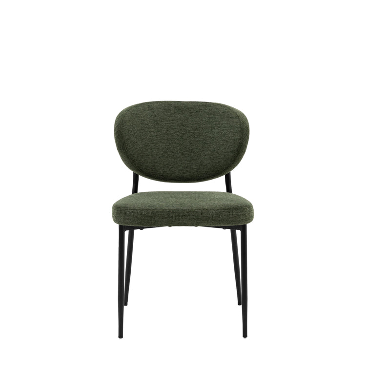 Elevate your dining experience with this chic chair, featuring a distinctive oval backrest and elegant black metal legs that bring a contemporary flair to your space. The plush upholstered seat ensures comfort, while the rich green fabric introduces an element of sophistication.