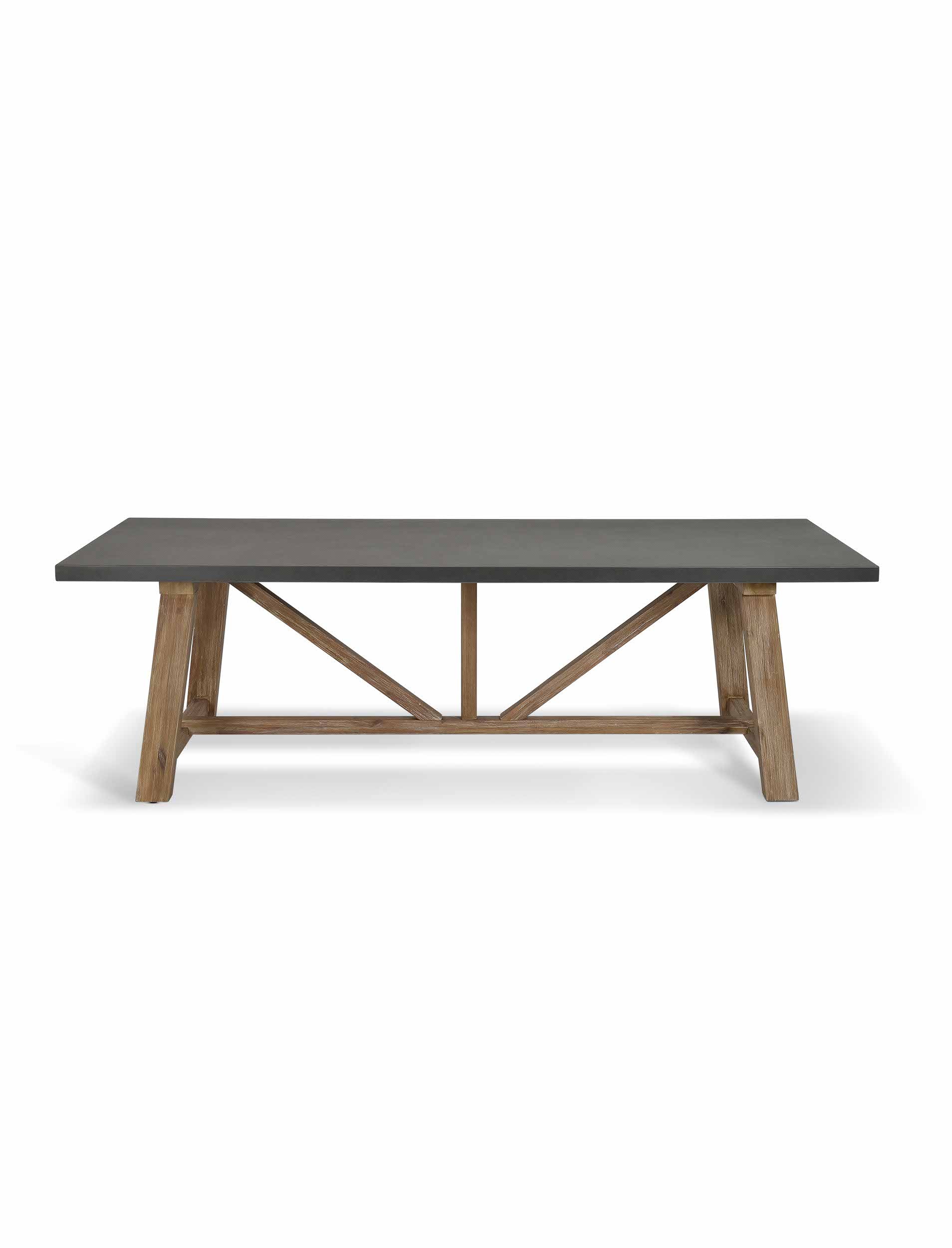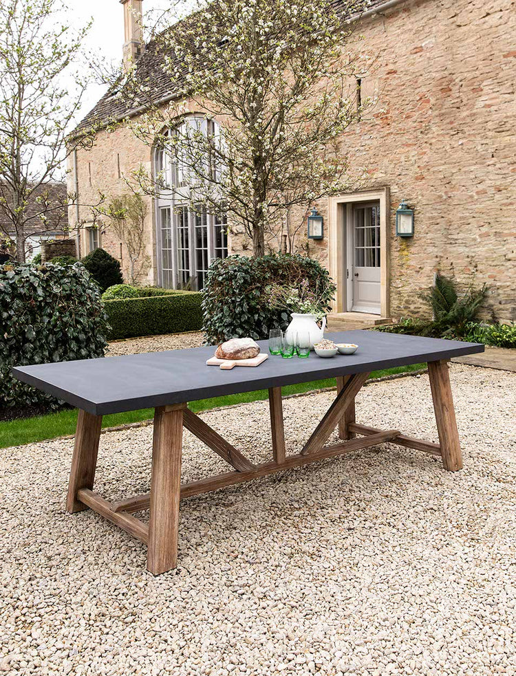 An elegant and modern choice for outdoor or indoor get-togethers, our trestle-inspired large Chilford Dining Table is equally suited to styling a garden or dining room. Meticulously crafted from Grey Slate polystone with solid acacia legs, this 240cm version has the proportions for a larger garden and room for all the family to gather around.