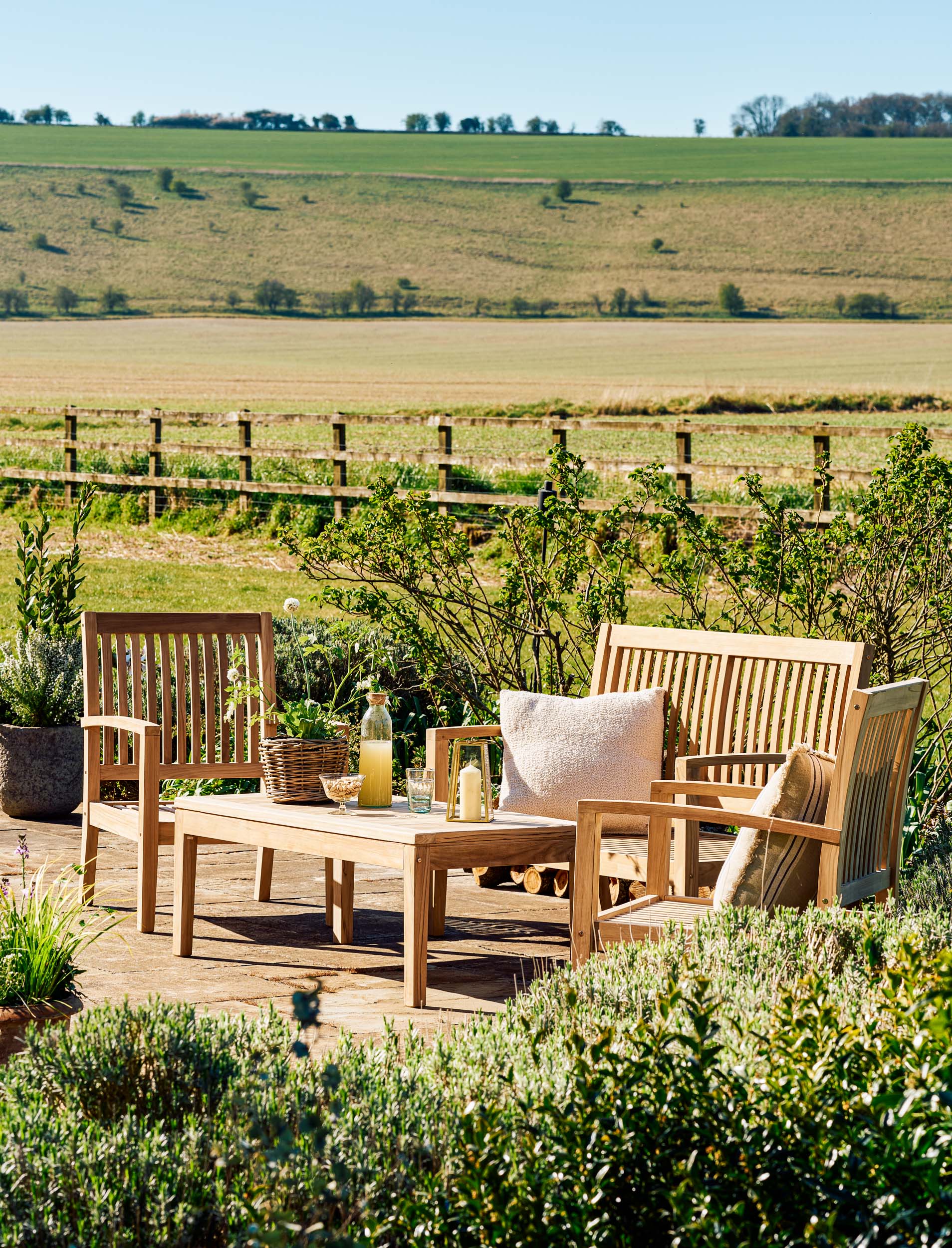 Furniture is delivered fully assembled within 3-4 weeks, ready to enjoy. Create an inviting outdoor lounge that’s made to be lived in with this timeless teak set—complete with two generous armchairs, a two-seater bench , and a perfectly proportioned coffee table. Handmade in Indonesia from solid, FLEGT-licensed teak, each piece is naturally weather-resistant, low maintenance, and rich in warm, natural tone. Designed to help you create your own outdoor sanctuary, this set offers an easygoing setting for everything from morning coffees to late evening conversations. A true staple for outdoor living.