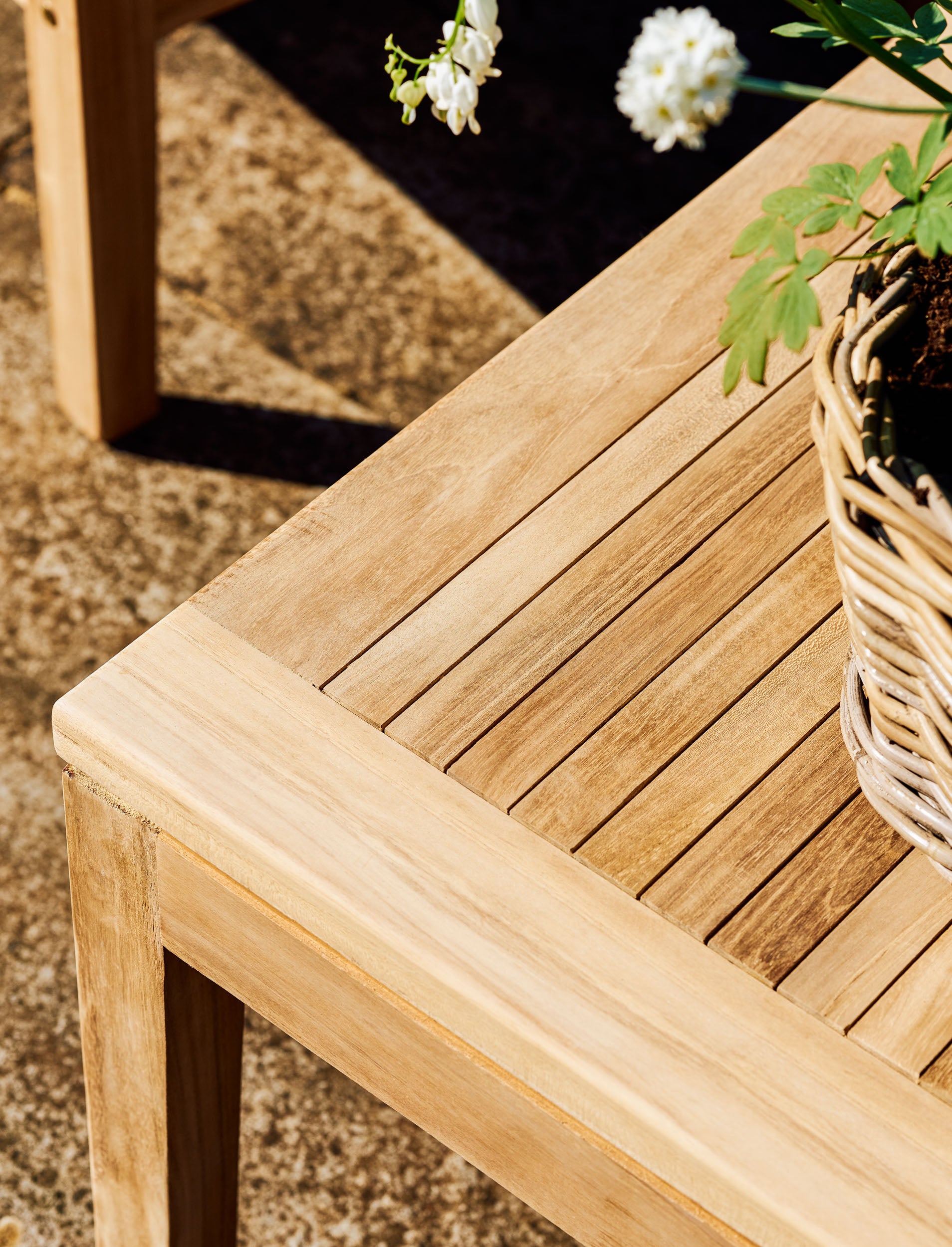 Teak wood is solid and strong, making it very appropriate for outdoor use as it has a strong resistance to weather. Low maintenance.