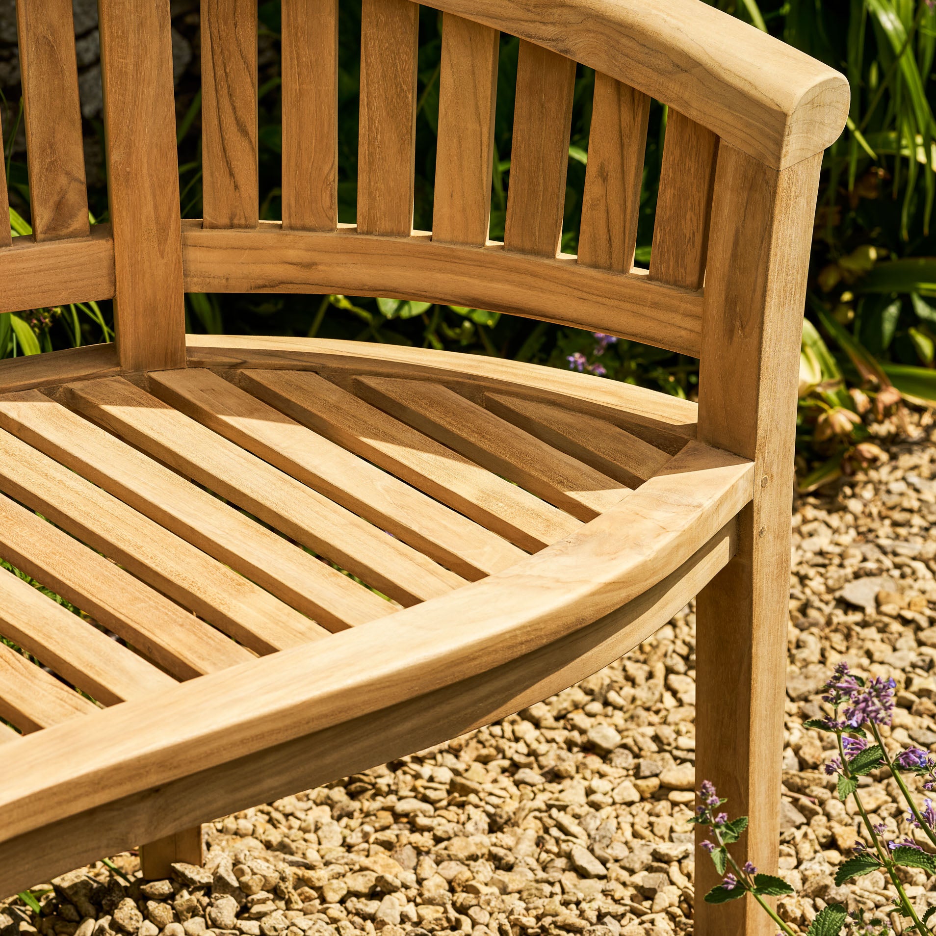 Furniture is delivered fully assembled within 3-4 weeks, ready to enjoy. Look forward to unwinding with a book on our Crummock Teak Bench on summer weekends in the garden. This solid wood bench is a contemporary take on the banana bench concept, with its traditional, elegantly curved all-in-one back and arms providing a comfortable place to sit and enjoy outdoor space. Perfect for placing on a patio, under a garden-facing window or in a shady spot beneath a tree, this bench comfortably sits three people. Its sturdily handcrafted from durable, ethically sourced teak and built to stand the test of time with minimal maintenance. You can even leave it outdoors all year round ready to catch those rare winter rays; pair it with our Crummock Coffee Table and you're sunshine-ready.