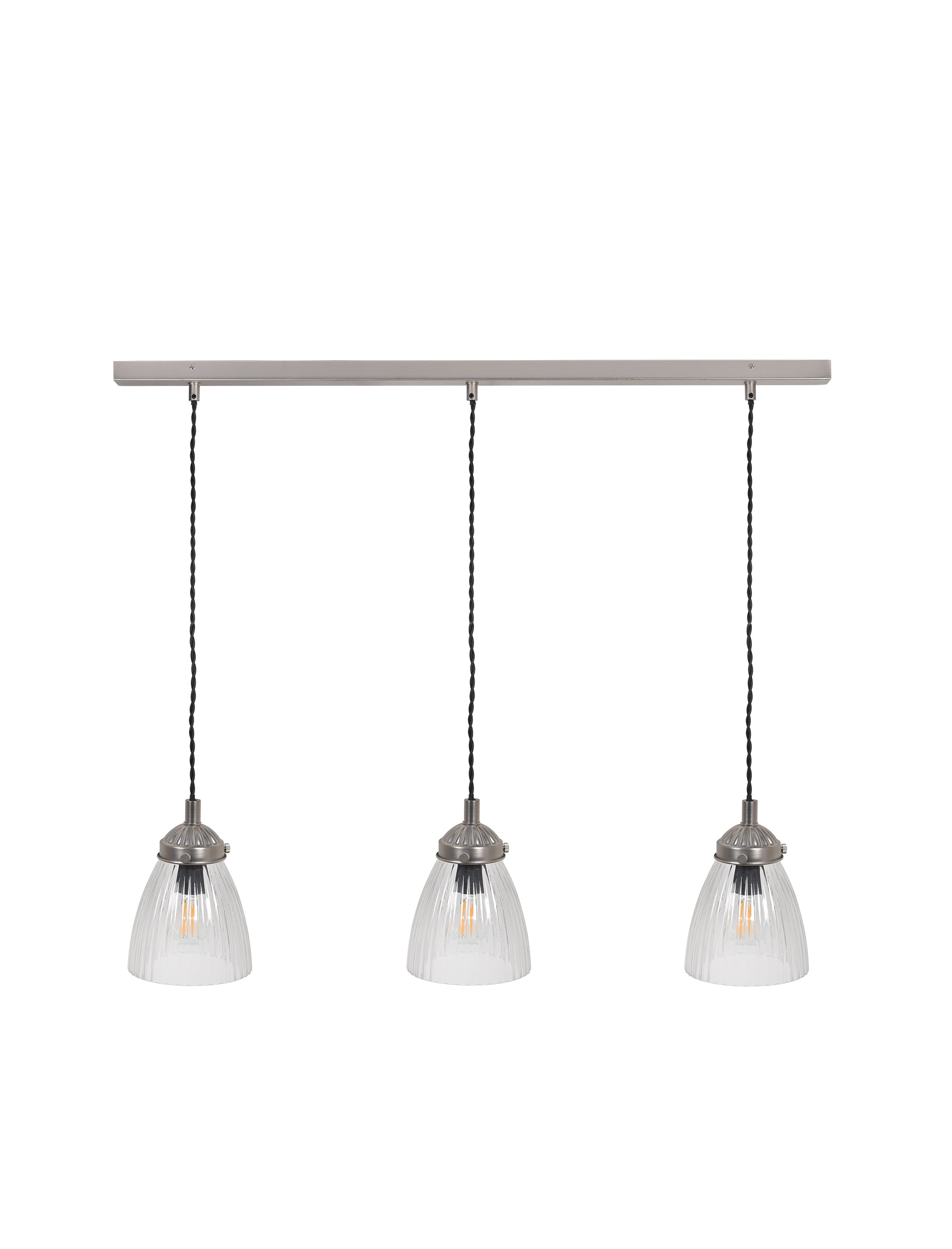 Make a statement with our Fovant Glass Triple Pendant Light. This sophisticated ceiling light has chic French-style fluted detailing on each of its three hand-blown glass shades, which are mounted on a metal bar. Finished with satin nickel coated steel fixings, this trio will create a stunning centrepiece wherever you hang it, whether that’s over a dining table, above a kitchen island or along a hallway.
