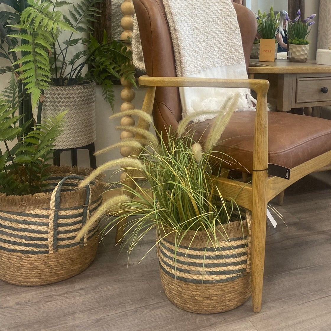Elevate your space with this exquisite set of three baskets, featuring tactile woven textures, striking ink blue stripes, and delicate fringing. These baskets serve as a chic storage solution, ideal for blankets, faux plants, and a variety of other items.