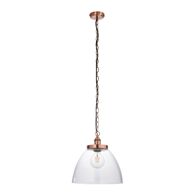 Experience the charm of an authentic 'resto' style industrial pendant, elegantly adorned with aged copper plating and featuring genuine knurled lamp holder accents alongside crystal-clear glass shades. Suspended from a height-adjustable black fabric cord, this piece pairs beautifully with filament LED bulbs to achieve the quintessential industrial aesthetic. It serves as an exquisite enhancement for contemporary homes, effortlessly evoking the trendy ambiance of a chic bar or bistro. Additional sizes and finishes are also available to perfect your desired look.