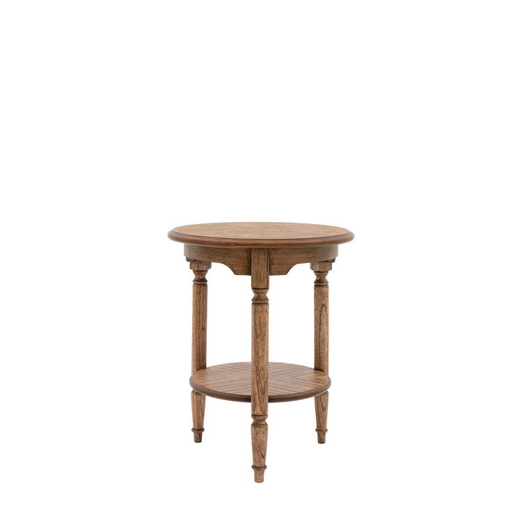 Presenting a 'new traditional' aesthetic, this exquisite side table combines timeless elegance with a contemporary flair. Crafted from luxurious mid-brown Mindy wood solids and veneers, it showcases intricate marquetry and inlaid book-matched accents that enhance its beauty.