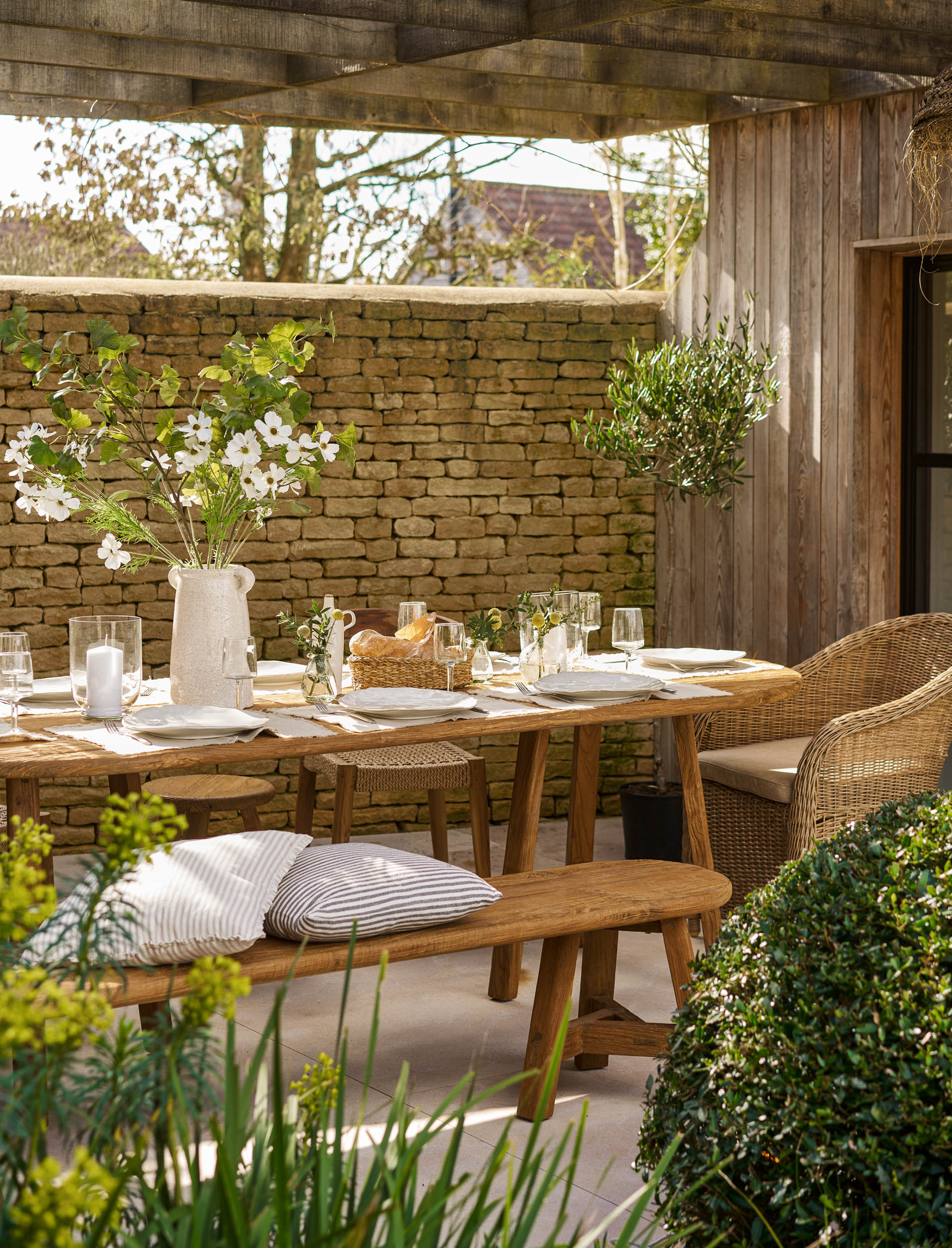 Reclaimed teak is renowned for being stronger than new teak, and it's very weatherproof, making it a great piece for the patio. Its natural shade of brown will turn silvery over time, adding to the visual appeal of its rustic, textured finish. Discreet black plastic feet stop the legs soaking up water after rain. Place this beautiful bench out on the terrace or in the dining room either side of our Indoor and Outdoor Round Hawthorne Dining Table or Oval Hawthorne Dining Table and you're ready to host everything from weekday family meals to laidback dinner parties.