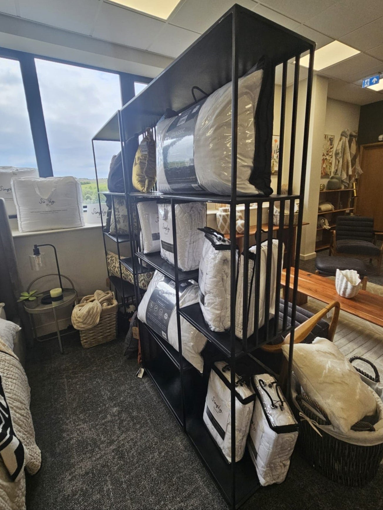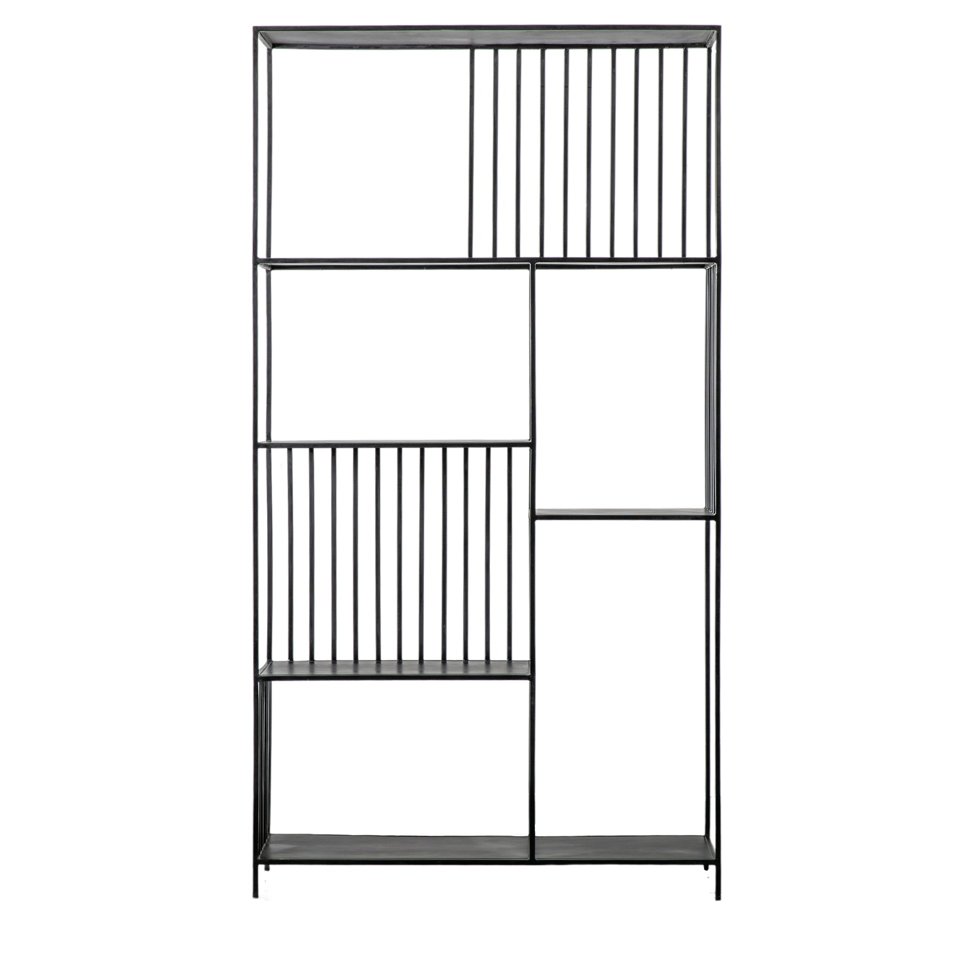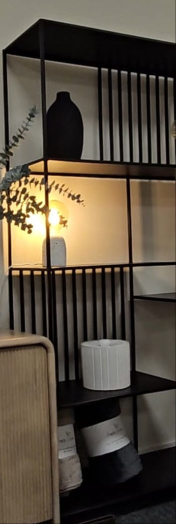 This strikingly modern open display unit is designed to captivate attention. Made from durable metal and finished in a sleek matte black, it showcases a unique slatted design that enhances its visual appeal.