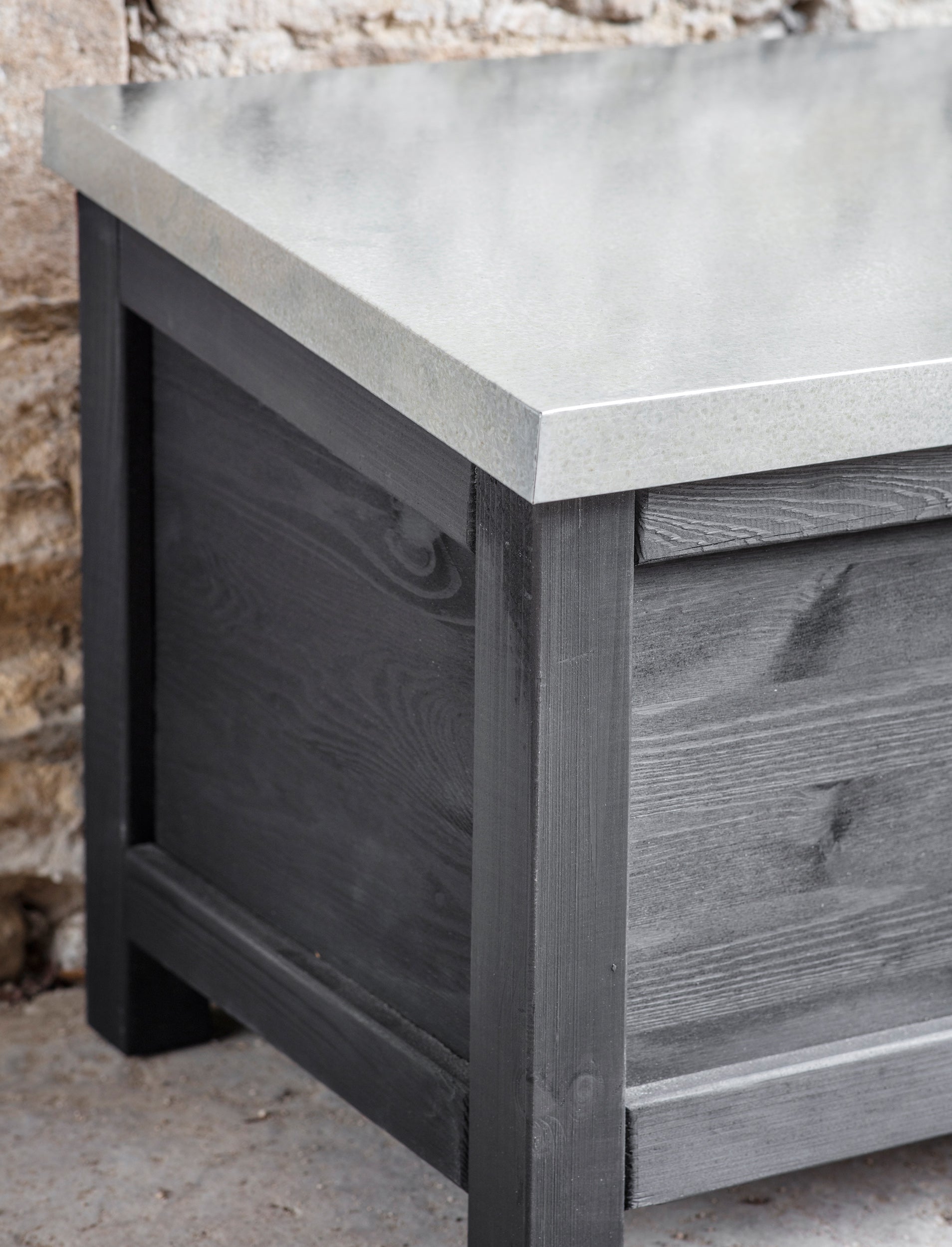 The hinged Galvanised Sheet Metal lid is slanted and silver tones offer a brilliant contrast to the dark tones. Weatherproof and durable the box is ideal for gardening tools, toys, boots and more. Each piece include black stoppers which can be fixed to the feet helping keep the wood dry and off the floor.