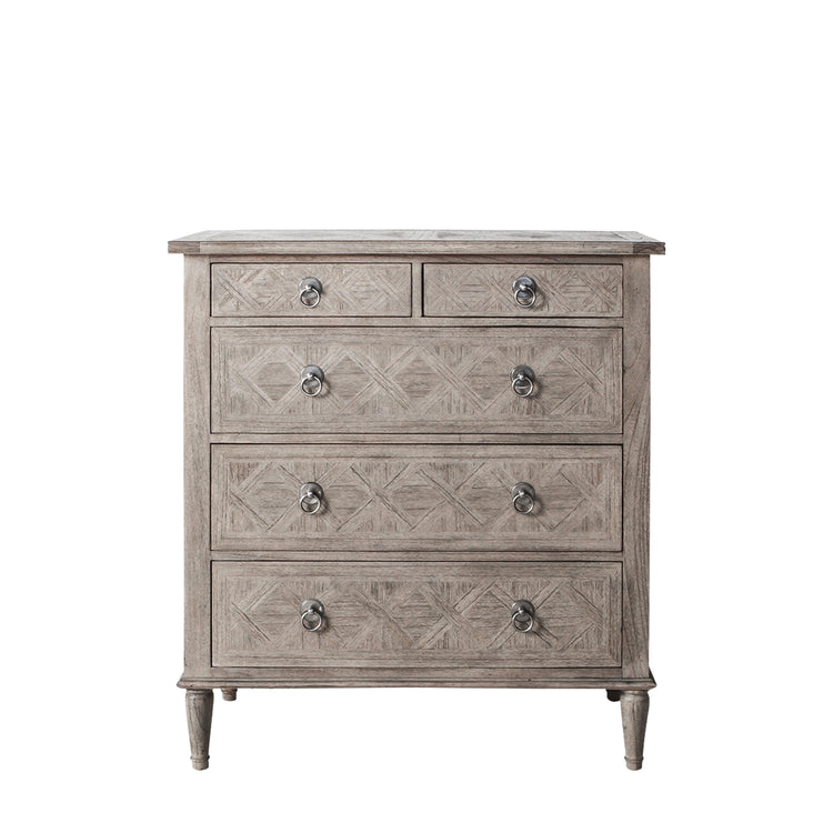 Made from Mindy wood and delicately brushed to replicate the natural aging process of a seaside veranda that has been exposed to sunlight and sand, this medium chest of drawers seamlessly combines the elegance of French Colonial design with a modern flair. This unique fusion makes it an ideal addition to any contemporary interior, enhancing the overall aesthetic of the space.
