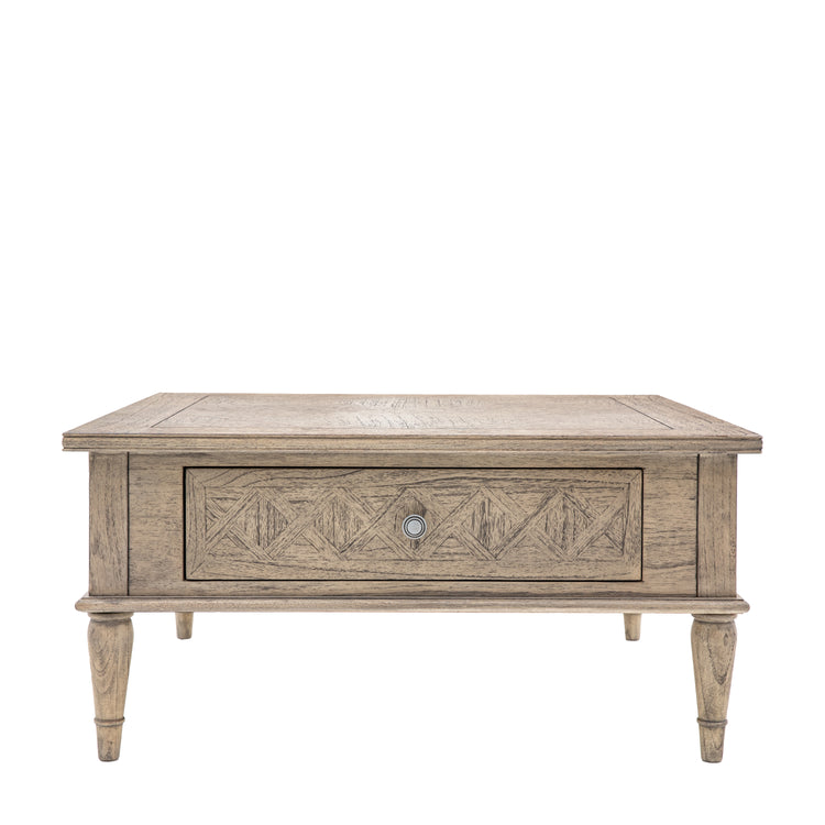 This generously sized coffee table combines both style and functionality. The tabletop and drawer front are adorned with the distinctive parquet-style design, while the gracefully turned legs contribute an air of sophistication to the piece.