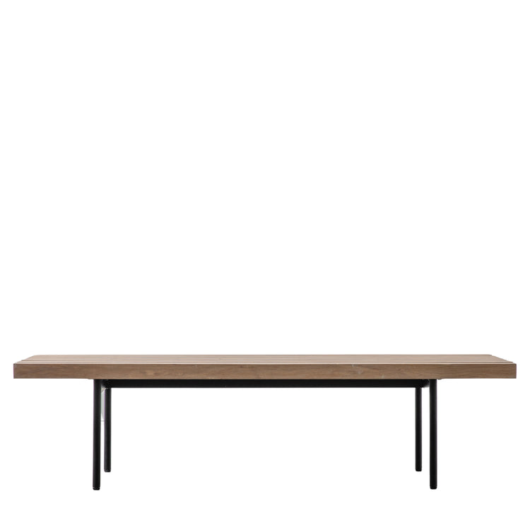 The coffee table, in particular, boasts a chic oak surface, enhanced by a captivating interplay of slats and routing that elevates its visual appeal. The slender black metal legs provide a sophisticated accent, completing the overall look.
