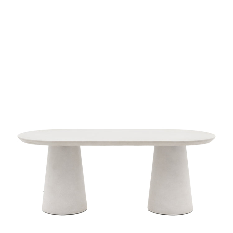 The Pennard table is a captivating furniture piece that harmoniously blends contemporary design with natural elements. The elegant oval tabletop, fashioned from resilient concrete, in a luxurious linen finish, rests upon two robust pedestal legs, ensuring a stable foundation. This distinctive fusion of materials imparts a modern and industrial aesthetic, making it an ideal choice for both indoor and outdoor dining environments.