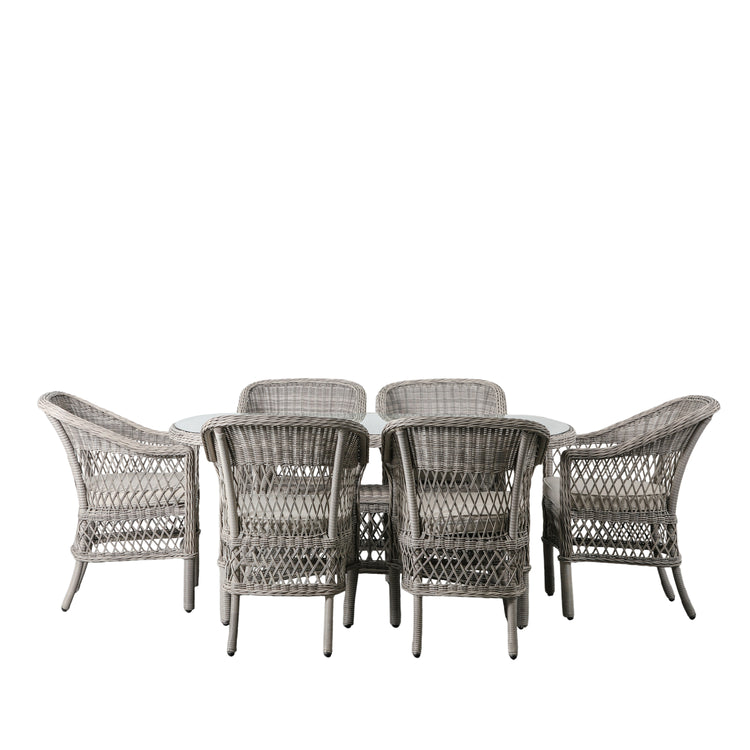 The stunning Penuel Oval Dining Set includes six elegantly designed dining chairs paired with a beautifully crafted oval dining table. Each piece is meticulously made from hand-woven, all-weather 5mm PE rattan, showcasing a sophisticated blend of close and open weave patterns in a delightful stone hue. For added comfort, the chairs are adorned with sumptuous, showerproof seat cushions in a soft tone that harmonizes with the rattan's colour. The table features a convenient shelf and a parasol hole, making it compatible with our crank and tilt parasols. Constructed with a powder-coated aluminium frame, the table is topped with tempered glass for durability and style. Additionally, a matching lounger and a sofa dining set are available to complete your outdoor ensemble.