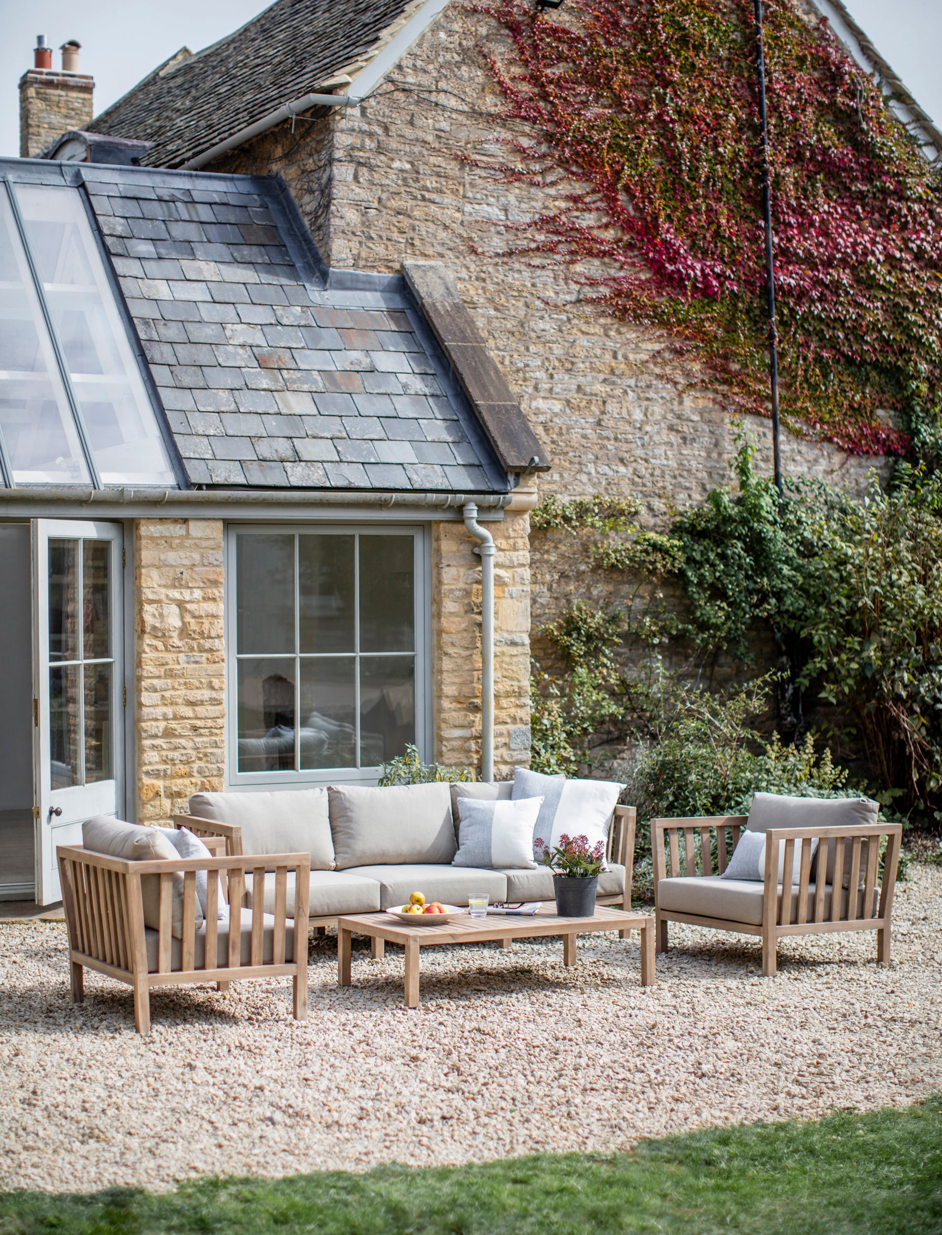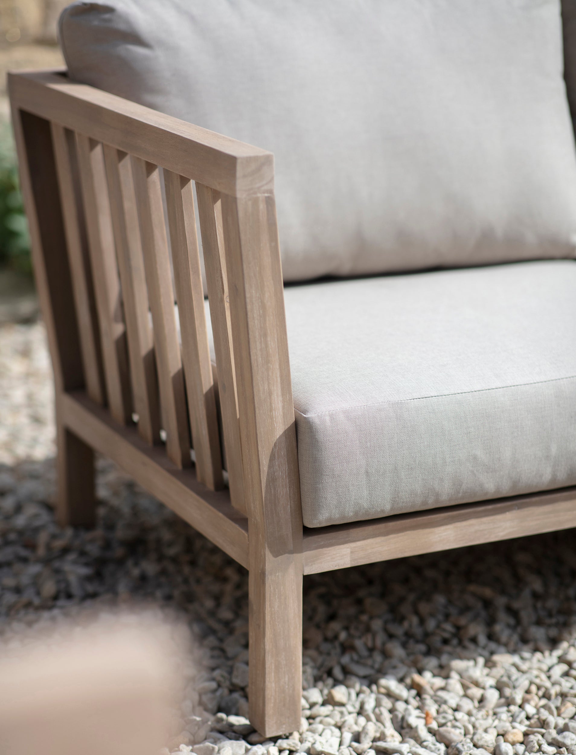 The Porthallow collection is designed for sophisticated garden entertaining and relaxing. Our Porthallow 3 Seater Sofa Set features a large sofa, two armchairs and accompanying coffee table. This generous selection is perfect for those looking to create an idyllic space for hosting and enjoying time outdoors with friends and family. Our paler whitewashed acacia wood frame and soft grey cushions will stylishly complement garden and patio areas for days spent in the sun.