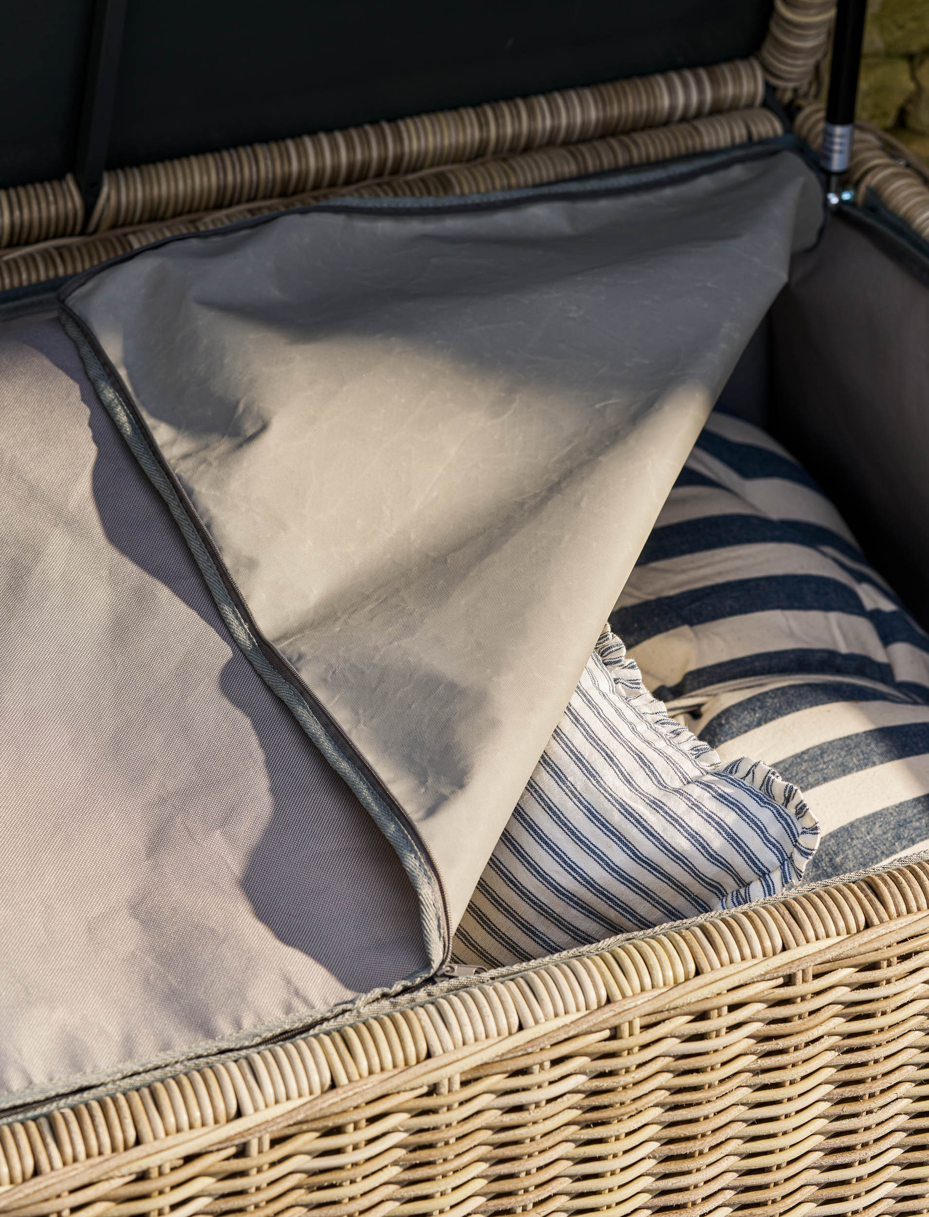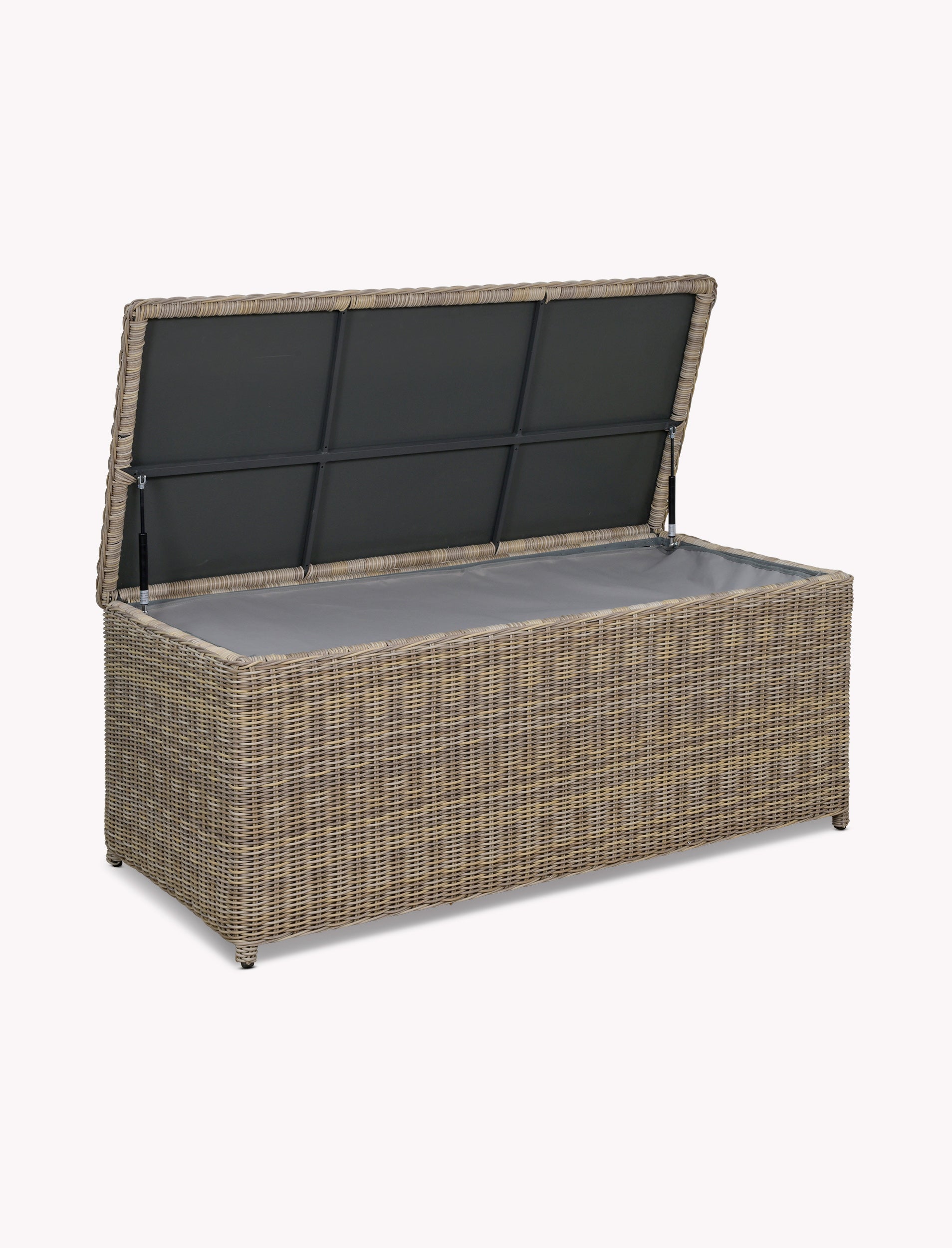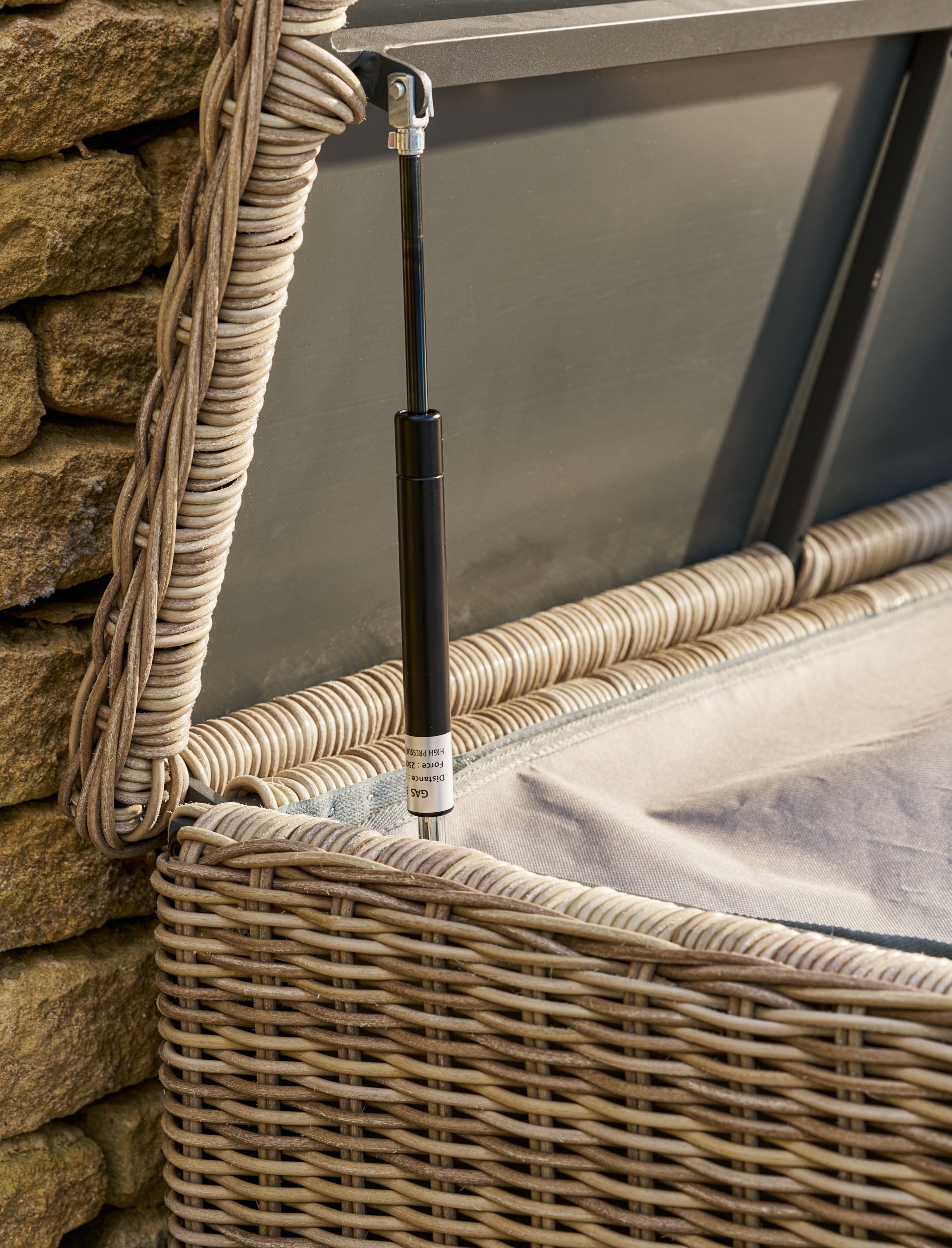 Our multifunctional Skala Outdoor Storage Box keeps things neatly stored away in style. Handwoven from long-lasting PE rattan over a strong, elegantly curved aluminium frame, it's weatherproof, UV and mould-resistant and features small colour variations that mimic natural rattan. This handy box has a gas strut soft-close lid, and it's fully lined with zipped, showerproof grey fabric to keep the contents safe and dry. It will perfectly fit the cushions from our Harting 3-Seater Sofa plus those from one Harting Armchair.